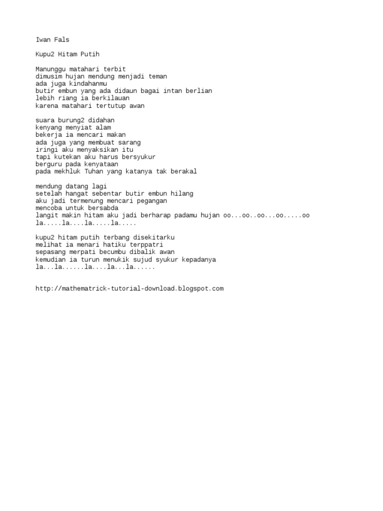 C kupu kupu hitam putih bm terbang di sekitarku bb melihat ia menari am hatiku terpatri iwan fals. Sepasang merpati bercumbu dibalik awan kemudian ia turun menukik sujud syukur padanya.